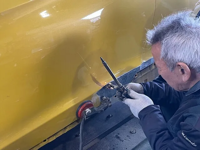 フレーム修正機を使って、ゆがんでしまった箇所を様々な角度から引っ張り、歪みを元通りになるまで修正します。