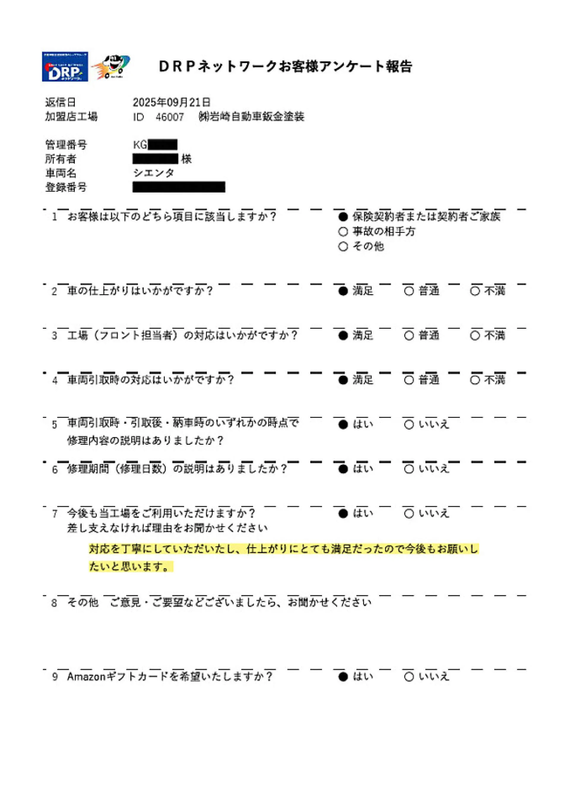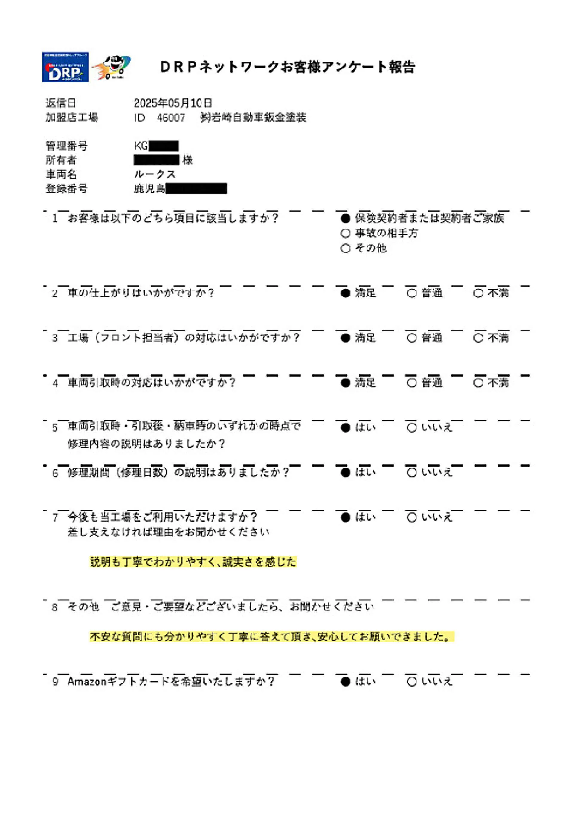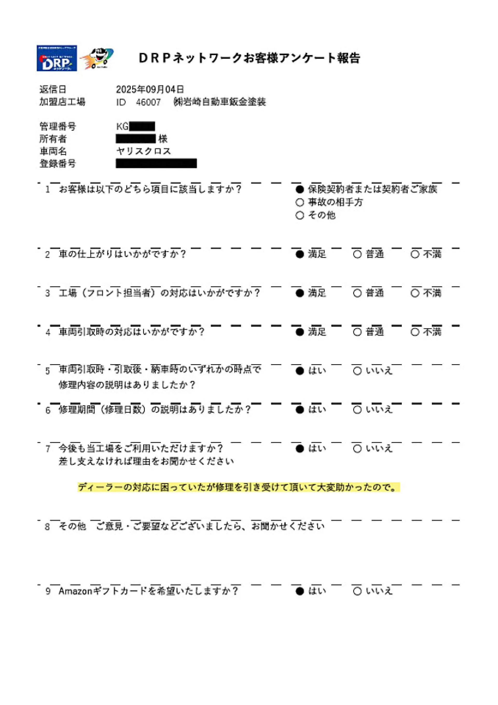 M様 この度は修理のご依頼いただきありがとうございました。ディーラーさんで代車がご用意出来ず、お預かりまで時間がかかるとの事で保険代理店様よりご紹介いただきました。貴重なアンケートありがとうございます!また機会がありましたらよろしくお願い致します。